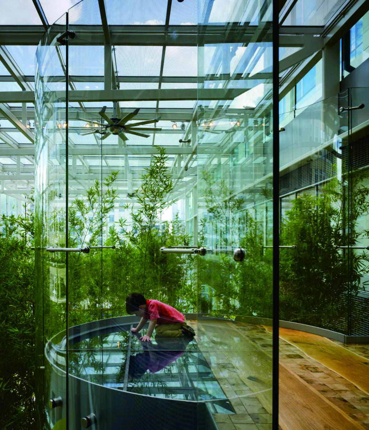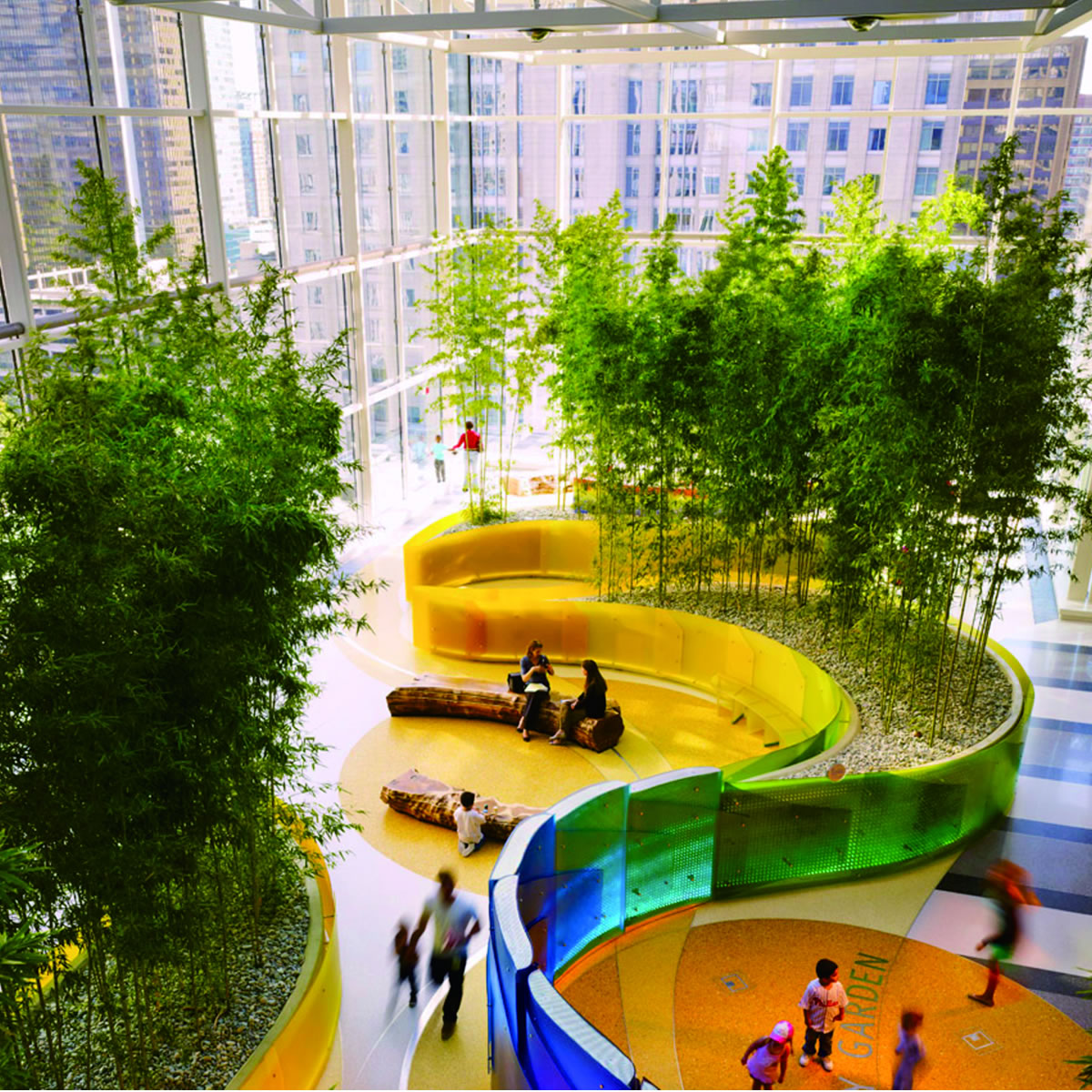 位于12層、在主體花園的上方,四周有從底下花園里延伸過來的竹林覆蓋,這個私密的空間是為嚴重免疫缺陷的住院兒童設計的,他們的身體狀況使得他們無法在主體花園中活動。這個被保護的空間有一系列水平交錯的回收木材的斷面,連接著墻和地板,里面填充著山核桃紋理的木板。木材的斷面選擇了各種各樣的樹種,從櫻桃、楓樹、白蠟樹到胡桃樹等。因為樹木包裹著玻璃墻,墻面上畫著天空、小鳥和從木板里露出來的樹葉。