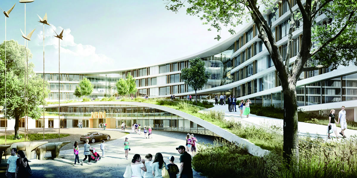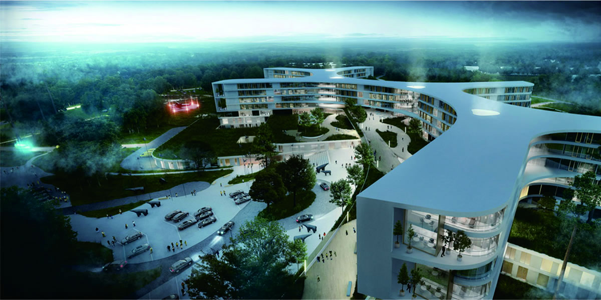丹麥North Zealand區,在靠近希勒羅德城的綠色景觀中為當地310000名居民建立一座造價38億丹麥克朗,面積超過124000平方米的現代化醫院。關于醫院的設計構想,建筑師期望創造一個與附近腓特烈堡宮具有同等標示意義的建筑體。醫院建筑與自然環境融合,為患者提供一個安全的治療環境,為醫生提供一個舒適的工作環境,為居民提供一個綠色的休閑環境。