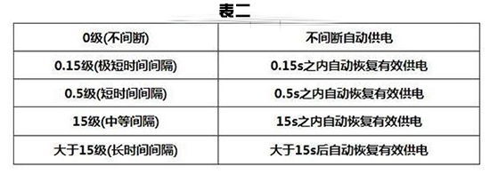 1、1類和2類醫療場所內,任一導體上的電壓下降值高于標準電壓10%時,安全電源應自動啟動。安全電源的分類應符合表二的規定: