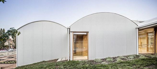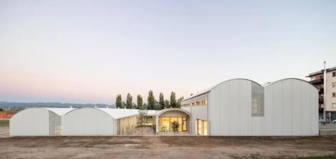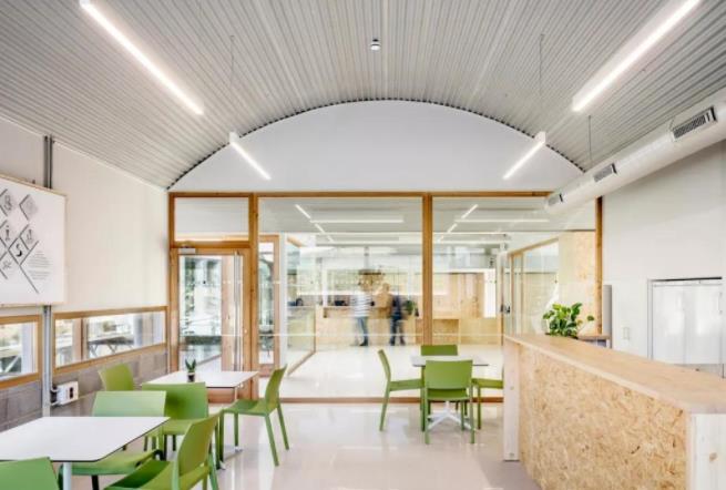 該建筑具有經(jīng)濟效益,模塊化和高效的能源系統(tǒng),可以根據(jù)內(nèi)部空間的功能和外部氣候來調(diào)節(jié)能源需求。間距2.4米跨度6米的金屬結(jié)構(gòu)支撐起輕便,易于通風的拱形屋頂,部分屋頂可以在夏天時開啟,便于通風,可在冬季關(guān)閉,防止熱量散失。