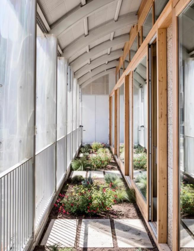 南立面上的蔬菜溫室是一處被動生物氣候調(diào)整系統(tǒng)。這些空間中的 pvc 簾幕的可以閉合,以便在冬季封閉以積聚熱量,并通過通風系統(tǒng)引入室內(nèi);或在夏季開放敞開,形成門廊提供蔭蔽。這些空間中的植被是都是由康復治療中心的患者種植的,同時也是他們治療的一部分。