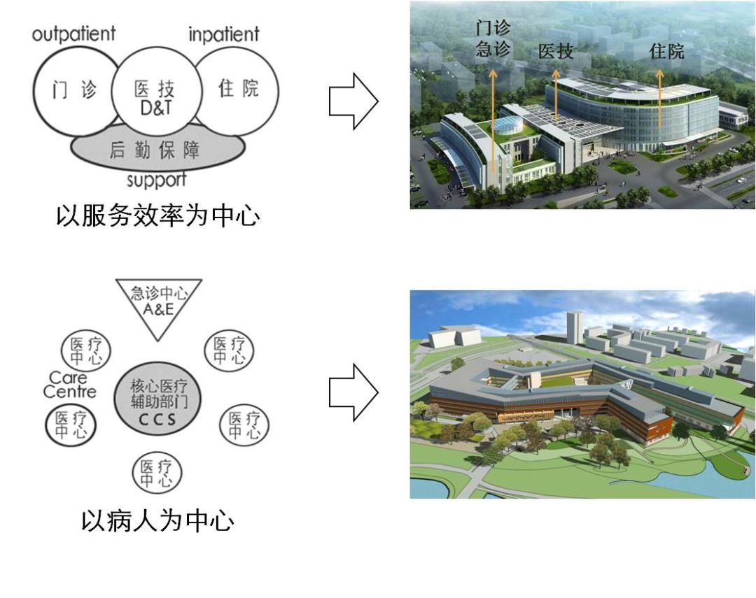 醫院的無序流動,是和我國醫院建筑及空間布局以及院內管理效率主導的,以前只有公立醫院,也不注重建筑的外觀及動向管理設計,只是保證醫院的各功能區域有就可以,作為一個龐大的公共建筑體,建成后也不可能再有大的改動。醫院主要分為門診、醫技、住院三部分,其中醫技布置在門診和住院中間,這種布局起初是便于醫生共享醫院的高精尖設備,降低成本,能為更多患者提供診療服務。在這種布局中,醫生不動,患者流動,也就造成患者需要在門診和檢查室多次往返。