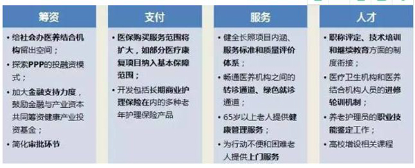 2015年11月,國務院辦公廳轉發國家衛計委、民政部、發改委、財政部、人社部、住建部等九部委《關于推進醫療衛生與養老服務相結合的指導意見》,明確了五大重點工作方向: