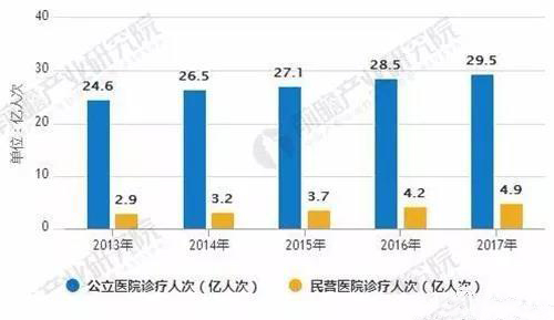 2017年公立醫院診療人次29.5億人次(占醫院總數的85.8%),民營醫院4.9億人次(占醫院總數的14.2%)。公立醫院入院人數15595萬人(占醫院總數的82.4%),民營醫院3321萬人(占醫院總數的17.6%)。相比較公立醫院,民營醫院的發展“多而不強”,總體仍處于被邊緣化的地位。