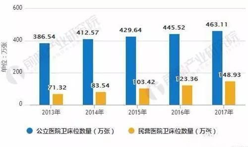 2017年末,全國醫院床位612.0萬張,比上年增加43.1萬張。其中,公立醫院床位4631146張,比上年增加175908張,床位占75.7%。民營醫院床位1489338張,比上年增加255701張,占24.3%。