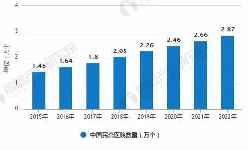 據前瞻產業研究院發布的《民營醫療行業市場前瞻與投資戰略規劃分析報告》統計數據顯示,截至2015年底,中國民營醫院數量為1.45萬個,同比增長15.7%;截至2016年底,民營醫院數量超過1.64萬個;截至2017年底,民營醫院數量達到1.8萬個。預計到2018年中國民營醫院數量將達到2.03萬個,未來五年(2018-2022)年均復合增長率約為9.04%,2022年中國民營醫院數量將達到2.87萬個。