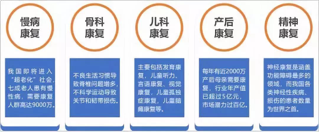 康復(fù)醫(yī)療根據(jù)病種需求進(jìn)行專業(yè)細(xì)分,主要包括骨科、兒科、慢病、產(chǎn)后、精神科等。據(jù)統(tǒng)計(jì),我國患有各種慢性疾病且有生活能力障礙需要康復(fù)的人群近9000萬,理論市場需求高達(dá)65%以上。而目前我國康復(fù)市場占比最大的為骨科及運(yùn)動(dòng)損傷康復(fù),而慢病康復(fù)市場占有率僅20%。老年人是患慢性疾病的主要群體,日益嚴(yán)峻的人口老齡化趨勢也讓慢病康復(fù)市場需求面臨爆發(fā),康復(fù)醫(yī)療將極大地提升老年群體的生活質(zhì)量。隨著慢病康復(fù)醫(yī)療的宣傳普及,民眾對于慢病康復(fù)的認(rèn)可度及接受度也與日俱增,老年康復(fù)市場凈利潤率能達(dá)到15%-20%左右,如果進(jìn)行連鎖化、規(guī)模化發(fā)展,利潤還有上升空間。