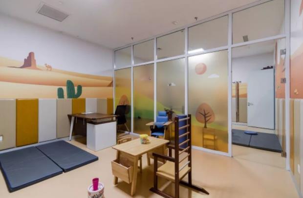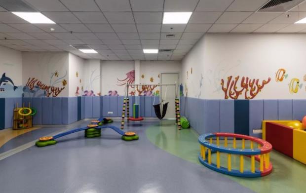 大樓二層是兒童康復特色專區,過道有專題墻繪故事寫真,三個主題康復室獨立設置在東側、南側和西側。該康復區用卡通童話作為主線,串聯沙漠、海洋、森林三個主題。