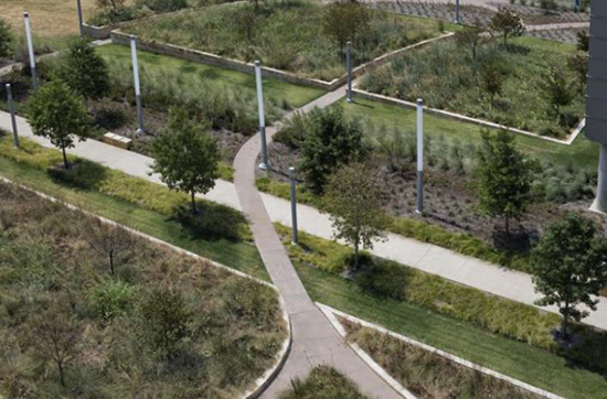 設計方案與整體的景觀設計相映襯,包括周邊的街景、停車場花園、入口廣場、健康花園、庭院、綠色屋頂、線性花園、沉思區(qū)和活動線路。一個多感官的本土景觀將這些顯著的特色景觀聯(lián)系起來,同時收集和運輸生態(tài)濕地(蜿蜒穿行于各種庭院、花園和醫(yī)院區(qū)域的公園)中的雨水。