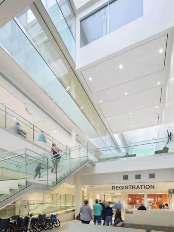 新建筑無時不刻體現了與外界大自然的連接。公共等候區的超大玻璃窗戶設計為患者及其家屬提供了良好的戶外景觀視野,可減少患者的束縛感。