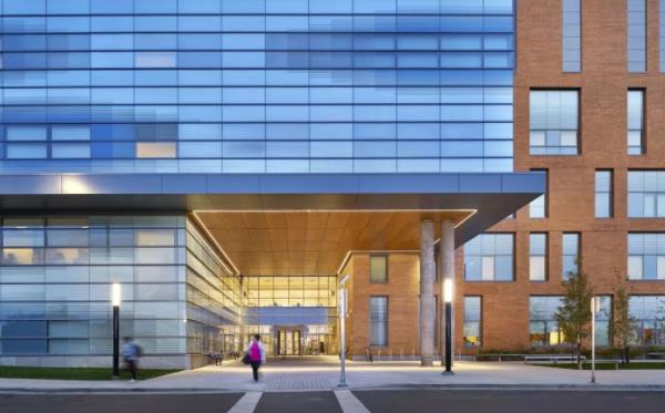 新門診大樓設計巧妙融入在醫院現有建筑中,樓體外立面使用磚塊結構,同時在玻璃窗戶面使用保護鍍層膜,以減少四層建筑物的規模體量。此外,建筑外部采用各種不同形式的材料,與現有醫院的翼樓以及周圍的低層郊區建筑交相輝映。