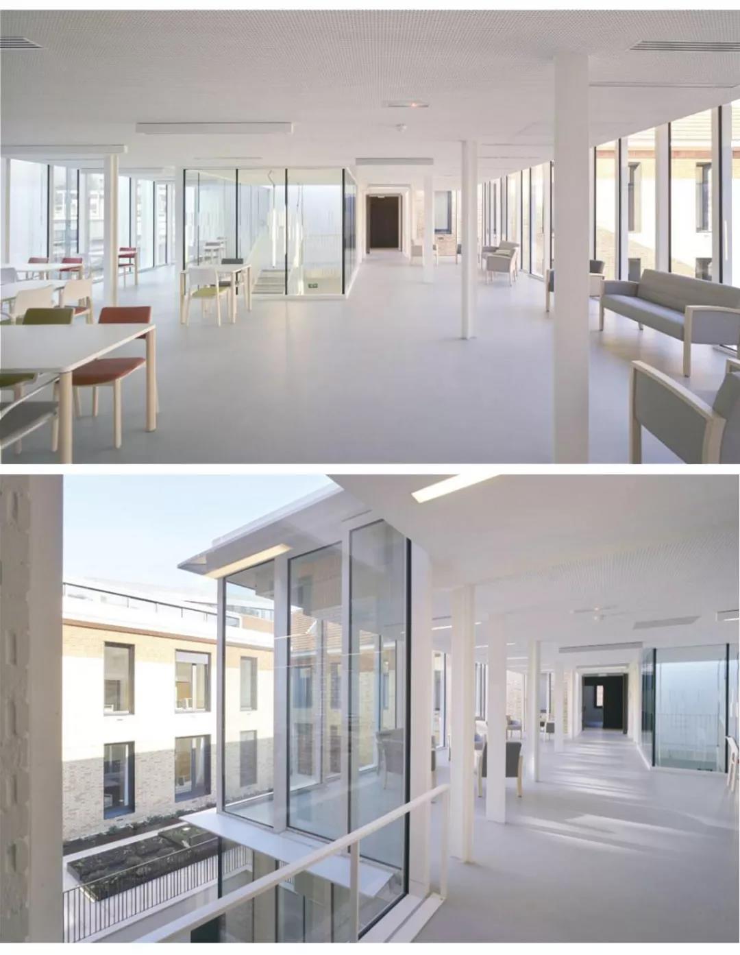走廊過道是養老建筑中一個重要的公共空間,老人們希望在這樣的空間上停留、交流或者欣賞室外景觀,所以可以在走廊過道上采用全景落地窗和高窗相結合的開窗方式,在保證老人安全的同時擁有良好的景觀視野。