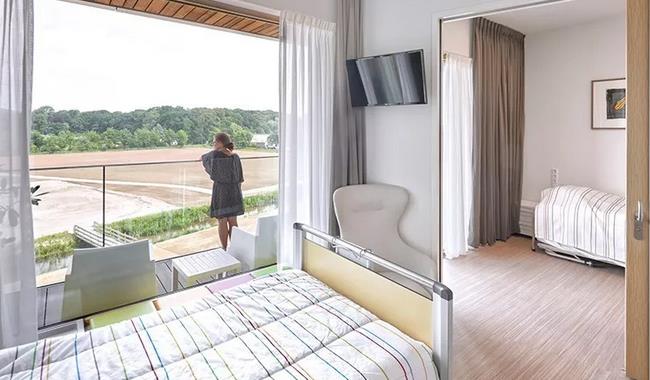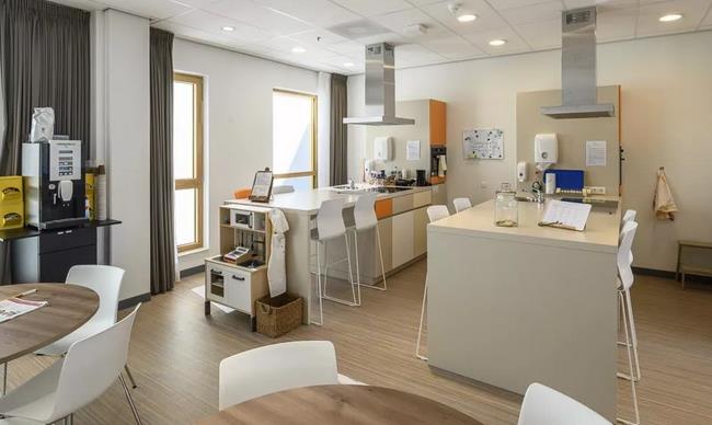 2樓和3樓設有帶廚房的用餐室。廚房設備齊全,配有洗碗機,只要提前預約、自備食材,就可以在這里做飯、用餐,非常有生活氣息。病房是套間規(guī)格的,患兒及家屬能享受到戶外風景,室內配備了簡單的家具,家長可以睡在相鄰的房間,以便隨時照顧孩子。