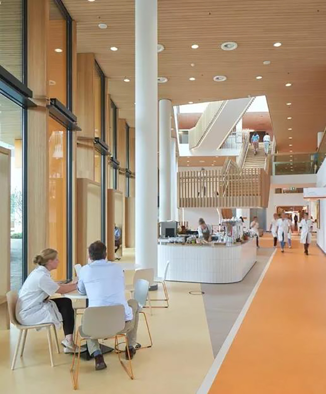 醫(yī)院一層大廳集中了接待、休息、餐飲、游樂場、臨時展覽等多項功能,并設計多個出入口,以減輕通行壓力。室內自然光線充足,明亮和愈合的視覺效果減緩了醫(yī)院慣有的高壓氛圍。整個空間以橙色作為基本色調,令空間極具活力。