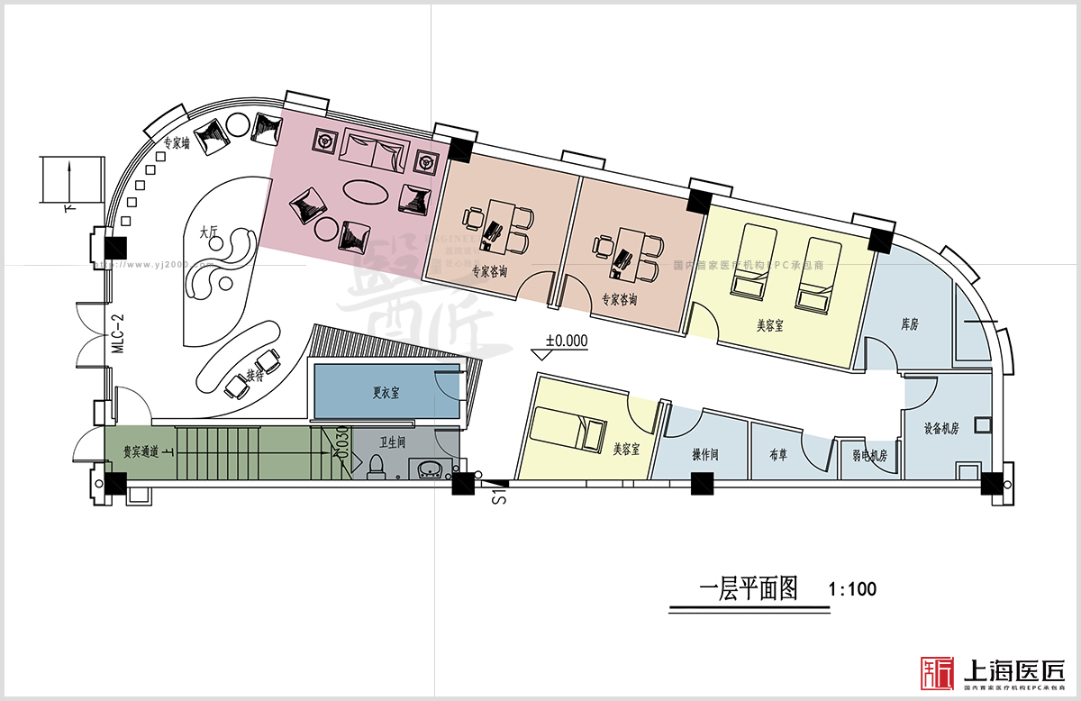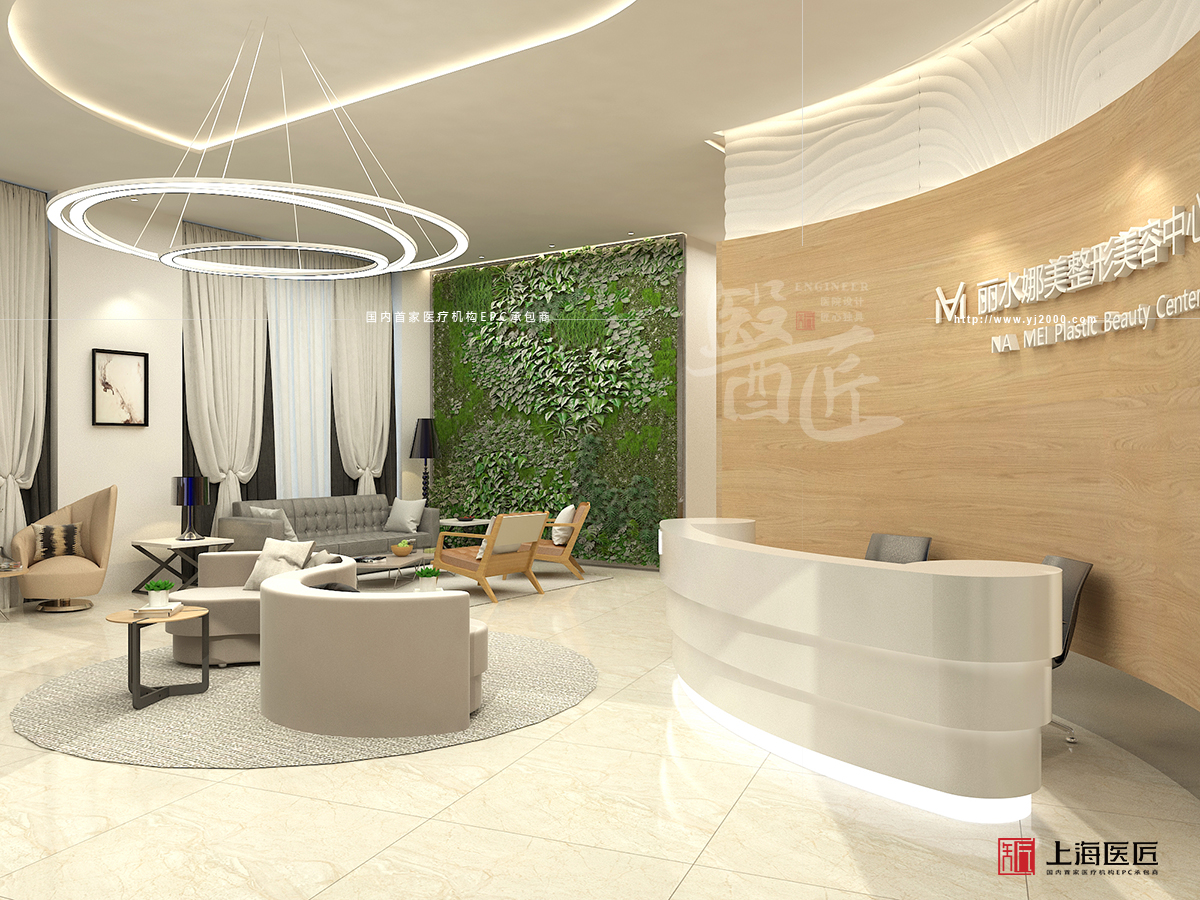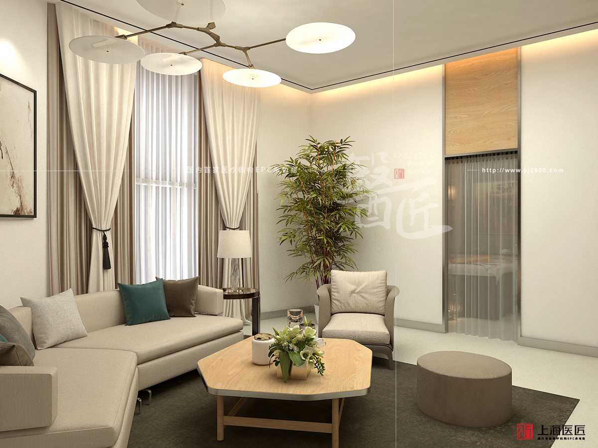水晶吊燈、山水畫、素色窗簾等配飾,使整個空間顯得更大氣、高雅。而辦公室、咨詢室之間的合理劃分,清新明快的色彩搭配,顯得溫馨而又自然。