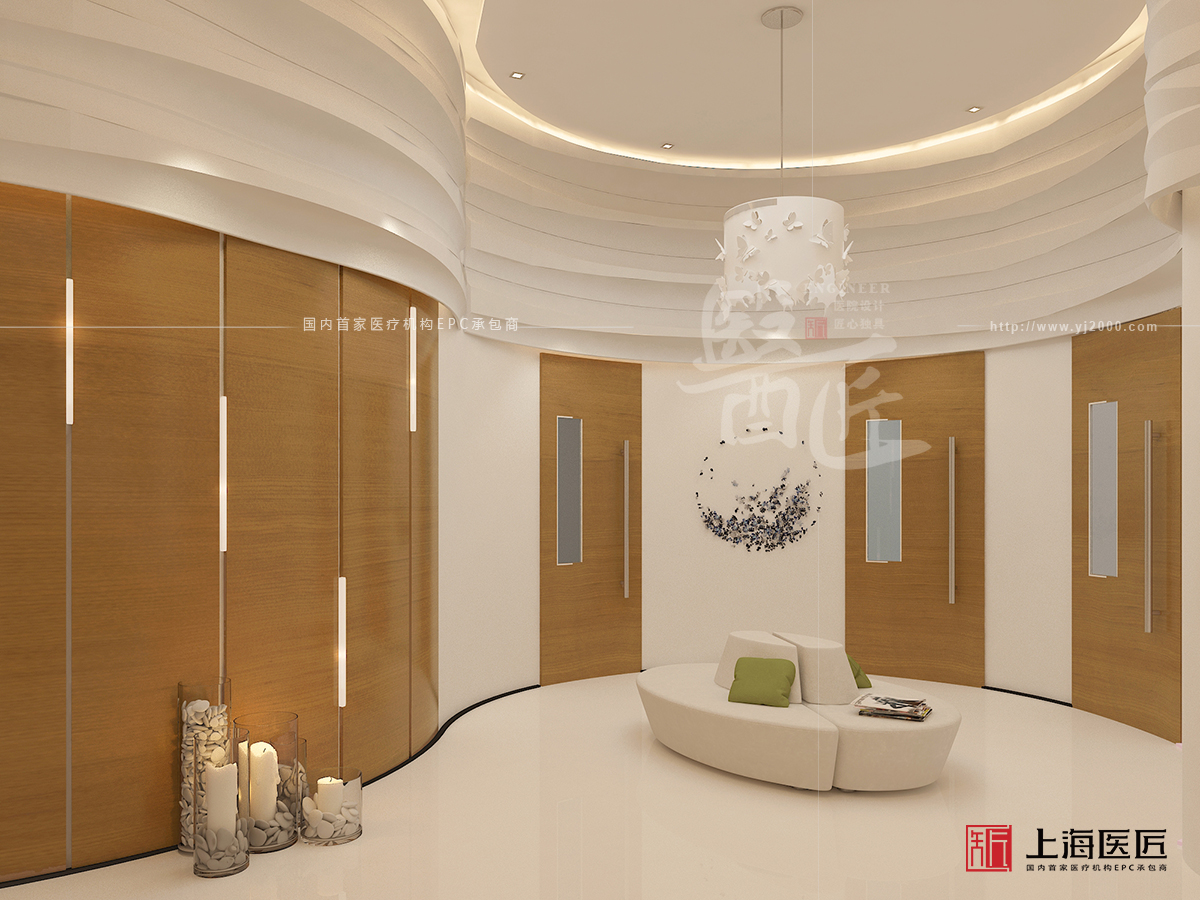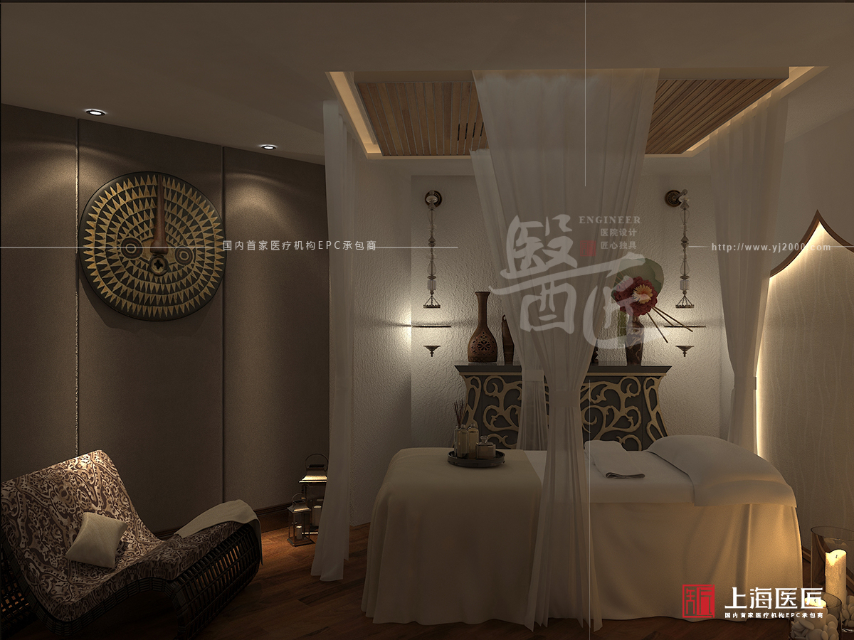 本案屬于韓式裝修風(fēng)格,以象牙白為主色調(diào),透著淡雅、清新的味道,而家具面積不大,線條流暢柔和,不僅符合亞洲人的嬌小玲瓏之感,還留給人文靜、優(yōu)雅的感覺。此外,墻面的掛畫、地毯的布置、手工制品的擺放等飾品,營造出家的氛圍,能有效緩解或消除到院者的不良情緒。